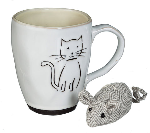 Ceramic cup with pet toy. Set of 2. Mug holds up to 16 ounces of a hot or cold beverage. Top-rack dishwasher safe. Microwave safe. Approximate Measurements: 6"W x 3.75"D x 4.5"H.