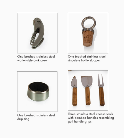 Perfect for the "19th Hole," the Sand Trap Cheese Board is a unique, golf-inspired cheese cutting board set made from rich bamboo and featuring two hidden swing-out drawers containing six stainless steel wine & cheese tools with bamboo handles: one crumbly cheese chisel knife, one hard cheese knife, one cheese fork, one waiter-style corkscrew, one knob-style bottle stopper, and one drip ring. Accents like the recessed juice groove surrounding the green, a carved-out "sand trap" for holding olives or tapenades, and a cute removable pin/flag pole held in place by a magnet makes this the ultimate gift for the golfer in your life. Fore!
