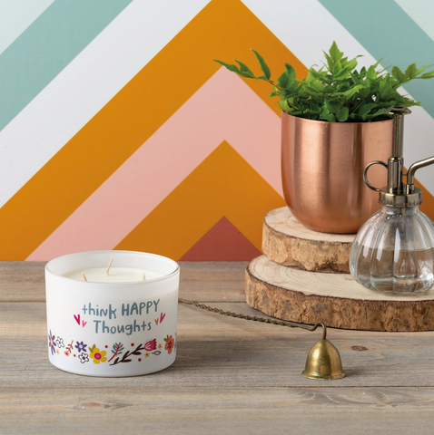 A frosted glass vessel holds this soy-based wax candle featuring a refreshing vetiver scent, an inspirational "Think Happy Thoughts" sentiment with vibrant floral designs. This 14 oz. candle makes a perfect gift. Our Happy Thoughts jar candle contains three fabric wicks for a total of 30 hours of burn time. Includes a plastic wax cover for protection and a polished look.