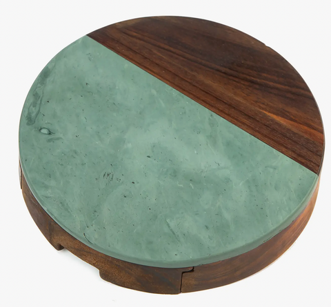 Round, earthy brown acacia wood and marble cheese board include three stainless steel serving tools that store securely inside the pull-out base drawer. A natural marble top adds richness to this functional board.